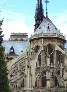 The Architect recalls that there was scaffolding up all around the rear sides of Notre Dame, as masons were restoring the flying buttresses of this medieval cathedral. This type of exterior reinforcing was required to brace the very tall walls against the horizontal thrust from the roof’s stone and timber arches.