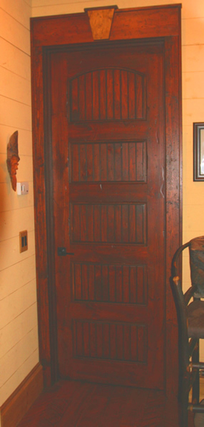 These are in the Falcon Cliff Lodge and appear to be 150 years old (they are actually new). They are made of white pine, although some folks believe they are wormy chestnut. The secret is in our custom distressing & finishing. We also design a variety of sensational mountain-themed doors with old world craftsmen who will carve your doors out of solid slabs of Honduran mahogany (or other species) if you wish. We are here to help you realize your dreams and exceed your expectations!